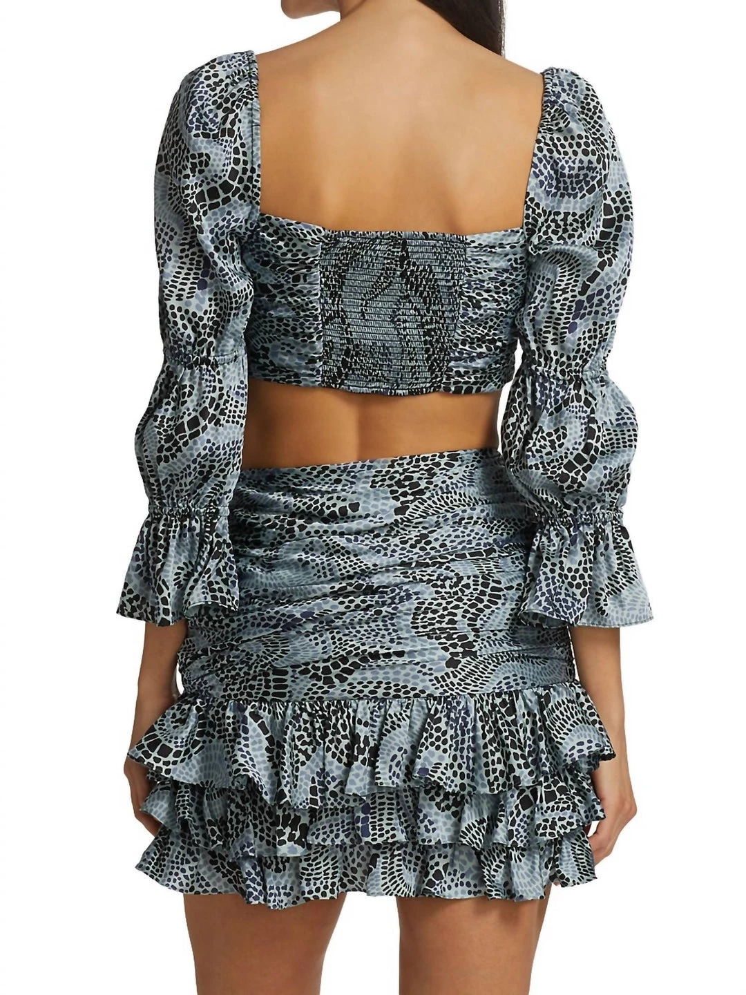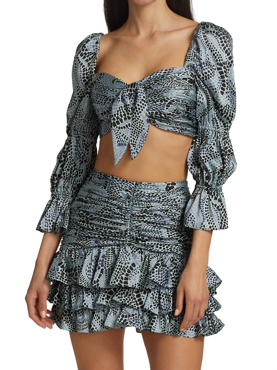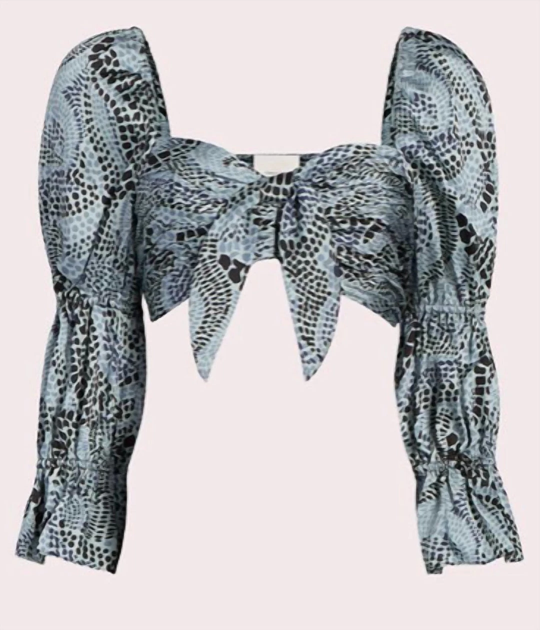 Cropped top in a graphic mixed dot print with puff sleeves.Sweetheart neckline with tieThree-quarter length elasticized puff sleevesSmocked backPull-on stylePolyesterLinedDry cleanImportedSIZE & FITAbout 16″ from shoulder to hemModel measurements – 5’10” tallModel is wearing a US size Small