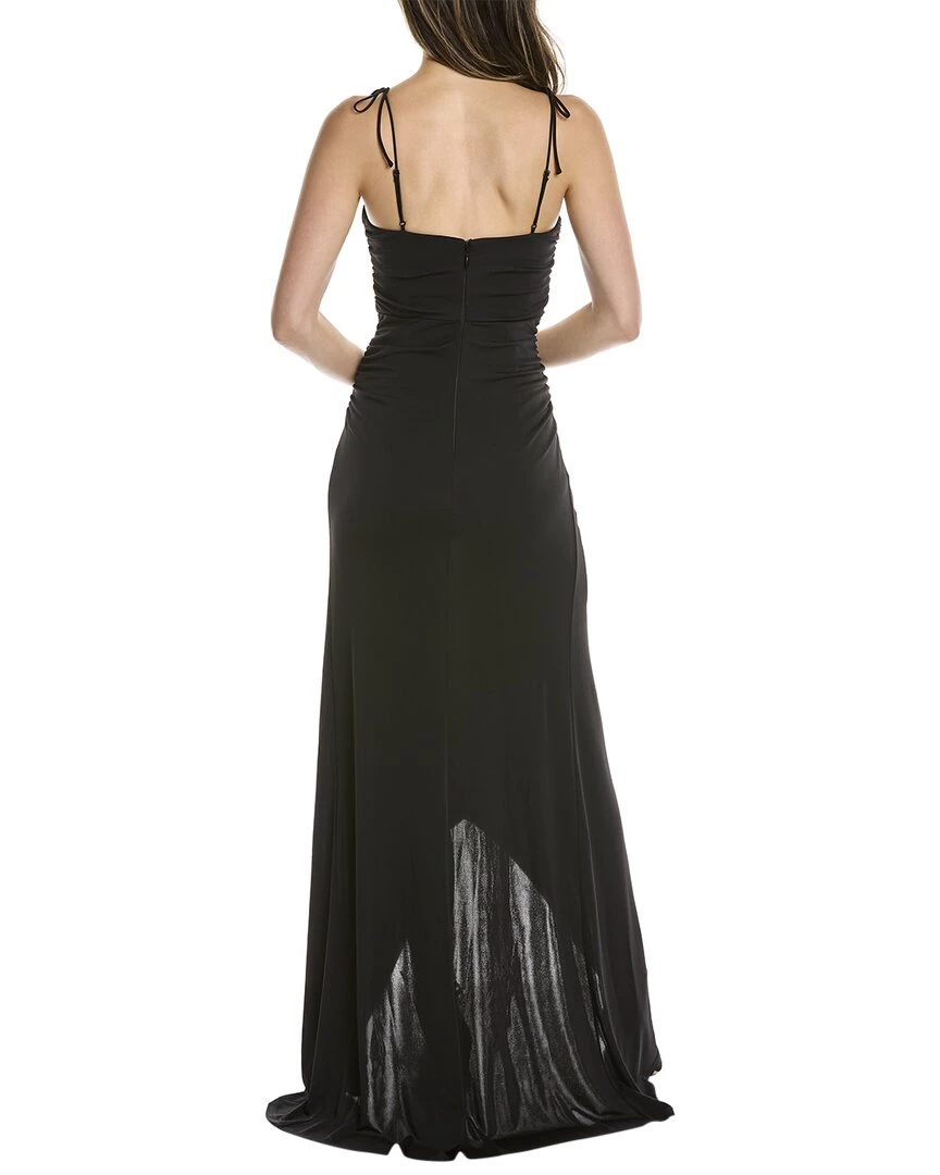 - Harlin Maxi Dress In Black With Self-Tie Shoulder Straps, Ruched And Twisted Bodice, Keyhole Front Cutout, And High-Low Hem
