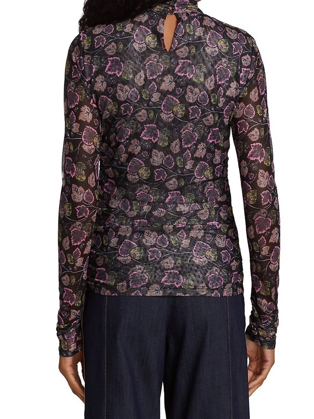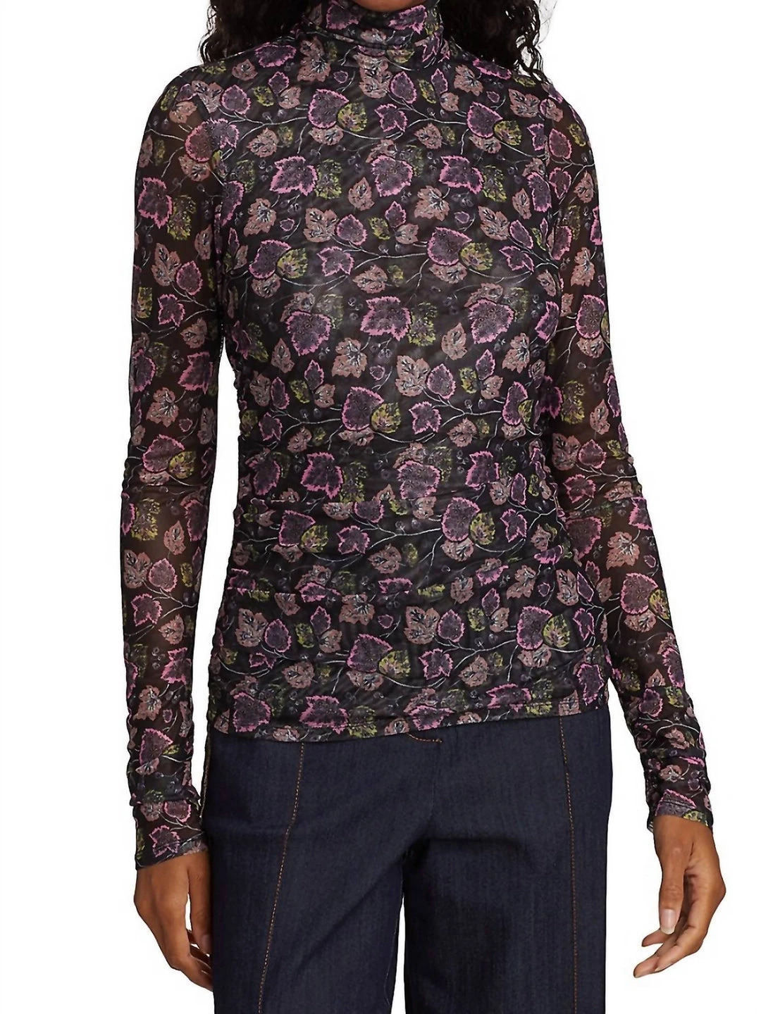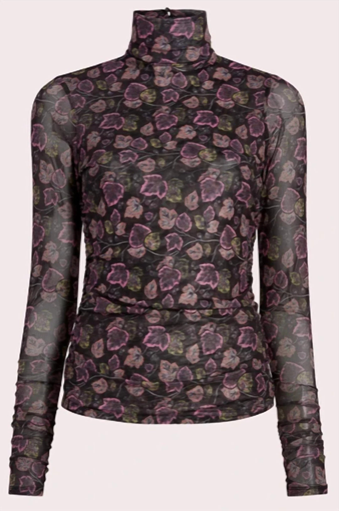 This turtleneck top features a semi-sheer ivy print in a fitted, ruched silhouette. Turtleneck Long sleeves Keyhole button closure Polyester/spandexDry clean Imported SIZE & FIT About 24.75″ from shoulder to hem Model measurements – 5’10” tall Model is wearing a US size SmallÂÂ