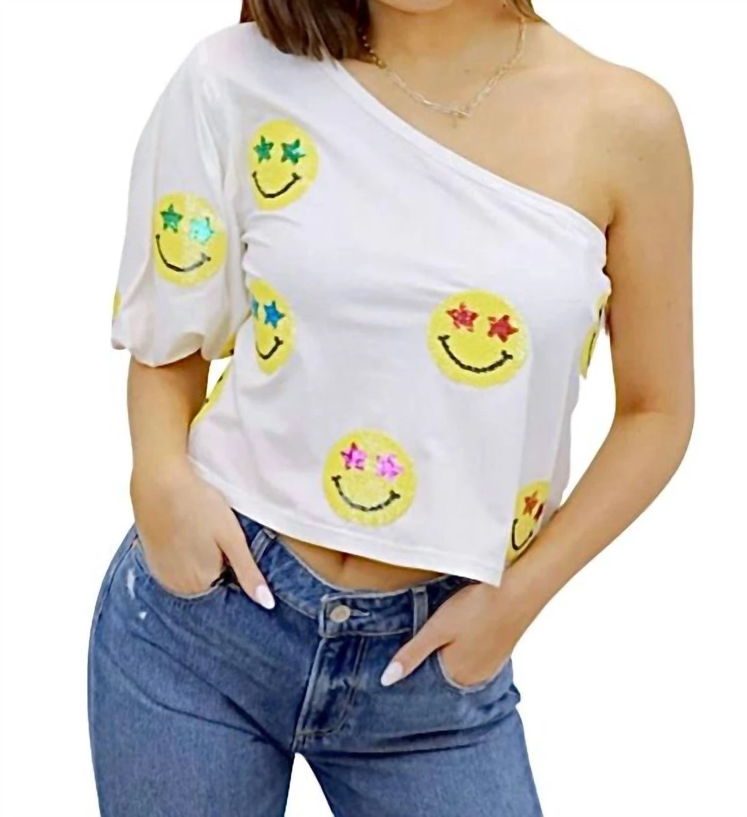 Be the first to review “Queen Of Sparkles One Shoulder Sequin Star Smiley Tee in White/Multi – women” Cancel reply