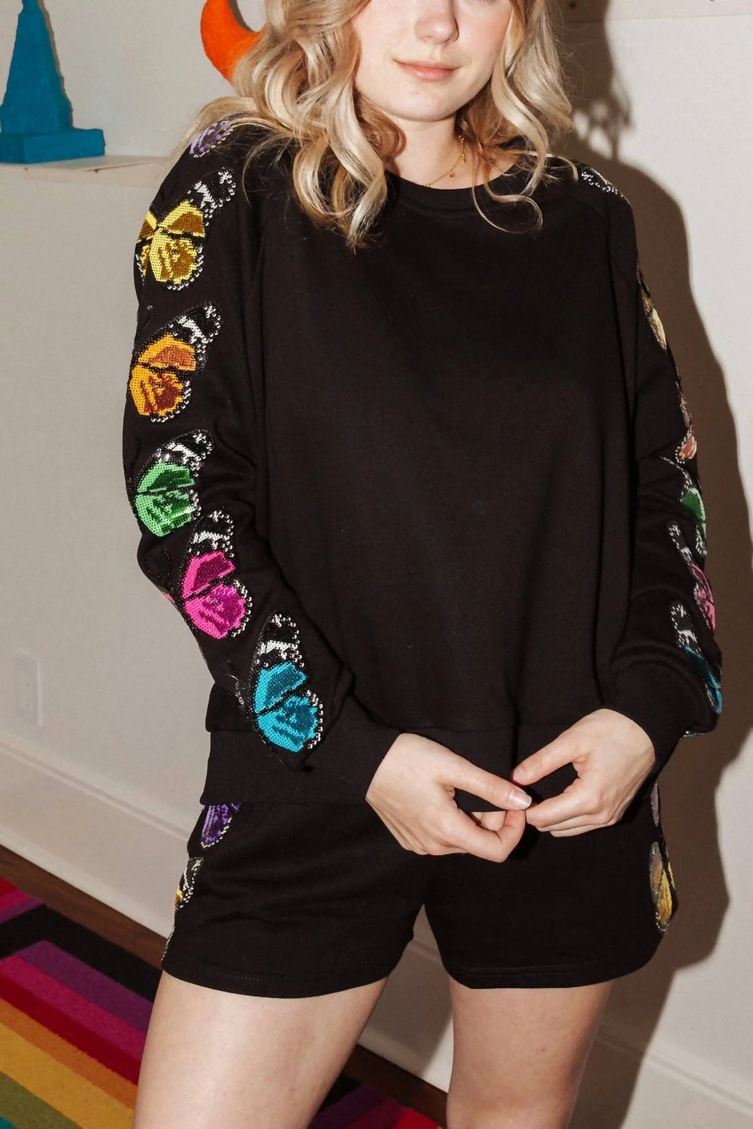 High waist style shorts with sequin detail on sides.Â